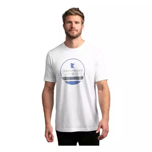 Circular graphic t-shirt featuring TravisMathew logo alongside the state of Minnesota